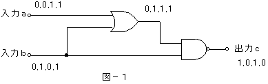 (3)論理回路の入力aに0,0,1,1、入力bに0,1,0,1を入力すると出力cは次のようになります。