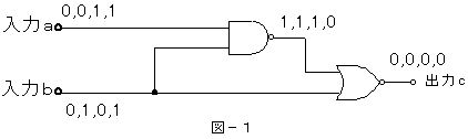 (3)論理回路の入力aに0,0,1,1、入力bに0,1,0,1を入力すると出力cは次のようになります。