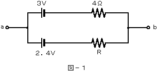 (1) 図−1に示す回路において、抵抗Rが( ア )オームのとき、端子a−b間の電位差は2.6ボルトになる。ただし、電池の内部抵抗は無視するものとする。