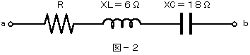 (2) 図−2に示す回路において、端子a−b間の合成インピーダンスを15オームとし、105ボルトの正弦波の交流電圧を加えたとき、容量性リアクタンスXcに加わる電圧は、( イ )ボルトである。