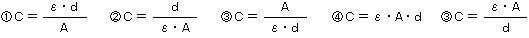(3) 面積がA、間隔がdの平行な二つの導体板の間に、誘電率がεの絶縁体をはさむと、導体板間の静電容量Cは、( ウ )の関係式で表される。