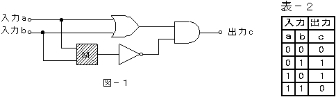 (3)図−1の論理回路において、Mの論理素子が( ウ )であるとき、入力a及び入力bの論理レベルと出力cの論理レベルとの関係は、表−2の真理値表で示される。