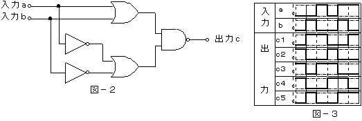 (4)図−2の論理回路において、入力a及び入力bに図−3に示す入力あるとき、図−2の出力cは、図−3のc1〜c5のうち( エ )である。
