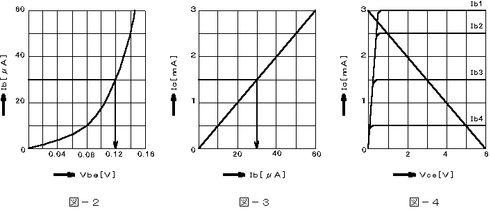 ベース電流は図−3より、Ib=30[μA]、Vbeの電圧は図−2より、Vbe=0.12[V]になります。