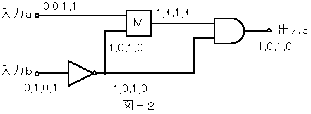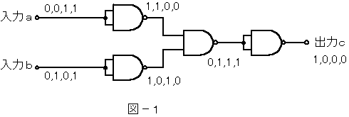 論理回路の入力aに0,0,1,1、入力bに0,1,0,1を入力すると出力cは次のようになります。