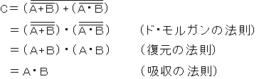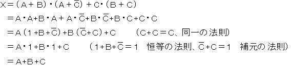 論理式を論理代数の公式を用いて簡単にすると、次のようになります。