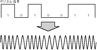 (1)図は、搬送波をデジタル信号で( ア )変調したことを示す。