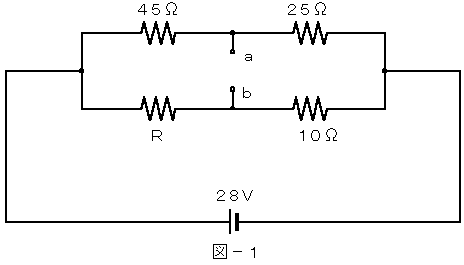 (1) 図−1に示す回路において、端子a−b間の電位差が15ボルトであるとき、抵抗Rを流れる電流は、( ア )アンペアである。ただし、電池の内部抵抗は無視するものとする。