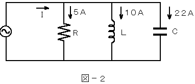 (2) 図−2に示す回路において、抵抗R、コイルL及びコンデンサCに矢印のような電流が流れているとき、全電流Iは、(
