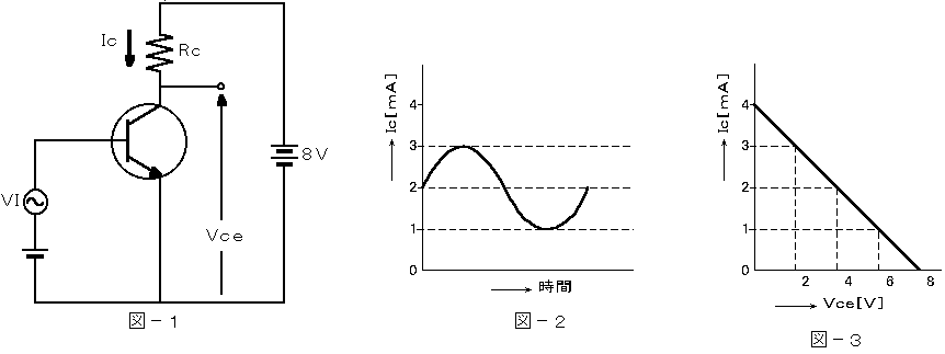 (2)図−1に示す回路において、ベースとエミッタ間に正弦波の入力信号電圧V1を加えたとき、コレクタ電流Icが図−2に示すように変化した。Icとコレクタ−エミッタ間の電圧Vceとの関係が図−3に示すように表されるとき、このトランジスタ回路の電圧増幅度を50とすれば、V1の振幅は( イ )ミリボルトである。