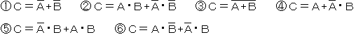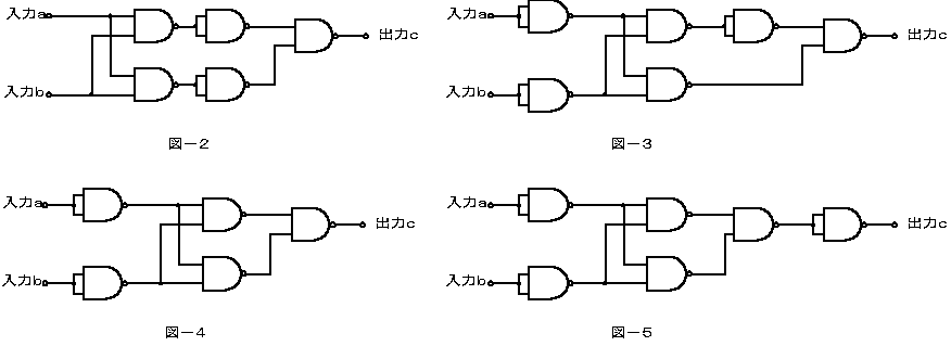 (3) 図−2〜図−5に示す論理回路のうちで、入力a及び入力bの論理レベル(それぞれA及びB)と出力cの論理レベル(C)との関係が、