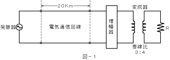 (1) 図−1において、電気通信回線への入力電力が( ア )ミリワット、その伝送損失が1キロメートル当たり0.8デシベル、増幅器の利得が16デシベルのとき、負荷抵抗Rで消費する電力は、80ミリワットである。ただし、変成器は理想的なものとし、入出力各部のインピーダンスは整合しているものとする。