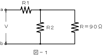 (1) 図−1に示す回路において、端子a−b間の合成抵抗が抵抗Rに等しく、かつ、抵抗R2が( ア )オームのとき、Rの両端の電圧は、端子a−b間の電圧Vの1/4である。