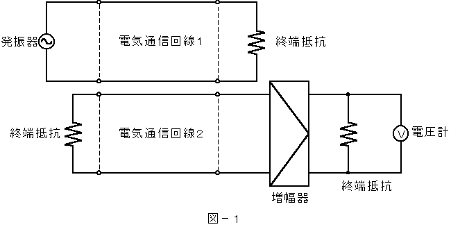 (1) 図−1において、電気通信回線1への入力電圧が( ア )ミリボルト、電気通信回線1から電気通信回線2への遠端漏話減衰量が56デシベル、増幅器の利得が16デシベルのとき、電圧計の読みは、2.3ミリボルトである。ただし、入出力各部のインピーダンスは整合しているものとする。