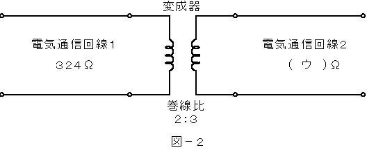 (3) 図−2において、電気通信回線1のインピーダンスが324オーム、電気通信回線2のインピーダンスが( ウ )オームのとき、変成器の挿入点における反射損失は、ゼロである。ただし、変成器は理想的なものとする。