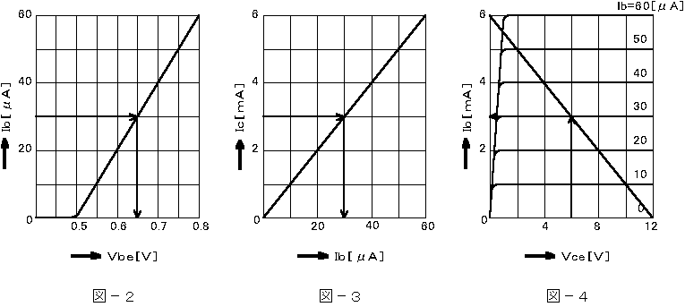 題意より、コレクタ−エミッタ間の電圧Vceは6[V]ですので、そのときの動作点Icは3[mA]になります。