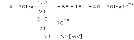 この式に、V2=2.3[mA]、L=56[dB]、G=16[dB]を代入してV1を求めると、