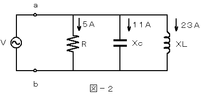(2) 図−2に示す回路において、端子a−b間の合成インピーダンスが11オームであるとき、容量性リアクタンスXcは、( イ )オームである。