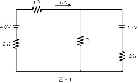 (1) 図−1に示す回路において、矢印に示すような電流が流れているとき、抵抗R1で消費される電力は、( ア )ワットである。ただし、電池の内部抵抗は無視するものとする。