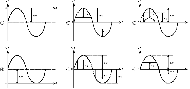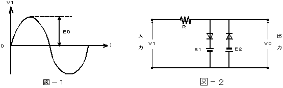 (2)図−1に示す正弦波形の電圧を入力V1として、図−2に示す回路に加えているとき、この回路の出力電力V0の波形は、( ウ )になる。ただし、ダイオードは理想的な特性を持ち、|E0|>|E1|>|E2|とする。