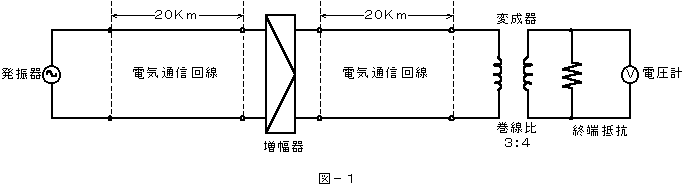 (1)図−1において、電気通信回線への入力電圧が120ミリボルト、その伝送損失が1キロメートル当たり1.0デシベル、増幅器の利得が( ア )デシベルのとき、電圧計の読みは、16ミリボルトである。ただし、変成器は理想的なものとし、電気通信回線及び増幅器の入出力インピーダンスは等しく、各部は整合しているものとする。
