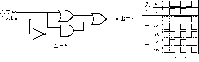 (4) 図−6の論理回路において、入力a及び入力bに図−7に示す入力があるとき、図−6の出力cは、図−7のc1〜c5のうち( エ )である。