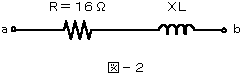 (2)図−2に示す回路において、端子a−b間に、40ボルトの交流電圧を加えたとき、抵抗Rに流れる電流が2アンペアであった。この回路の誘導性リアクタンスXLは、(