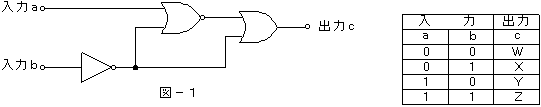 (3)図−1の論理回路において、入力a及び入力bの論理レベルと出力cの論理レベルとの関係が右の真理値表で示されるとき、表中の出力レベルW、X、Y、Zは、それぞれ(