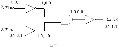 (1)論理回路の入力aに0,0,1,1、入力bに0,1,0,1を入力すると出力cは次のようになります。