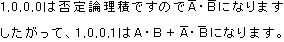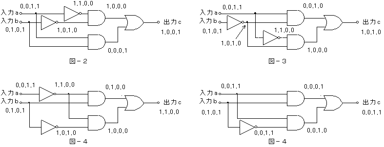 (3)各論理回路の入力aに0,0,1,1、入力bに0,1,0,1を入力すると出力cは次のようになります。
