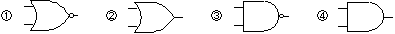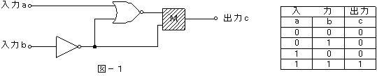 (3)図−1の論理回路において、Mの論理素子が( ウ )であるとき、入力a及び入力bの論理レベルと出力cの論理レベルの関係は、右の真理値表で表示される。