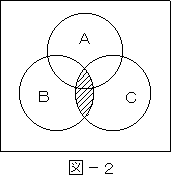 (4)図−2に示すベン図において、A、B及びCは、それぞれの円の内部を表すとき、塗りつぶした部分を示す論理式は、( エ )で表すことができる。 (4点)
