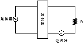 (1)図において、発振器の出力電流が180ミリアンペア、減衰器の減衰量が( ア )デシベルのとき、電流計の読みは、1.8ミリアンペアである。ただし、入出力各部のインピーダンスはすべて同一値で整合しているものとする。 (5点)