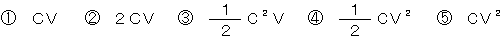 (3)Xボルトに充電したCファラドのコンデンサをCアンペアで放電すると、電圧が低下しX秒で0ボルトになる。したがって、蓄えられていた静電エネルギーは、( ウ )ジュール(ワット秒)である。     (5点)