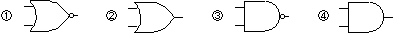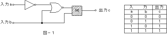 (3)図−1の論理回路において、Mの論理素子が( ウ )であるとき、入力a及び入力bの論理レベルと出力cの論理レベルとの関係は、右の真理値表で示される。          (5点)