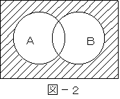 (4)図−2に示すベン図において、AとBは、それぞれの円の内部を表すとき、塗りつぶした部分を示す論理式は、( エ )で表すことができる。         (5点)