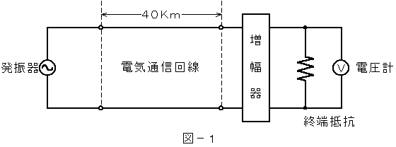 (1)図−1において、電気通信回線への入力電圧が12ミリボルト、その伝送損失が1キロメートル当たり0.8デシベル、増幅器の利得が12デシベルのとき、電圧計の読みは、( ア )ミリボルトである。ただし、入出力各部のインピーダンスはすべて同一値で整合しているものとする      (5点)。