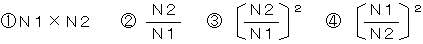 (3)図−3において、電気通信回線のインピーダンスをZ1、負荷インピーダンスをZ2、変成器の一次側、2次側の巻き線数をそれぞれN1、N2とすると、Z1/Z2=( ウ )のときにインピーダンスが整合する。ただし、変成器は理想的なものとする。   (5点)