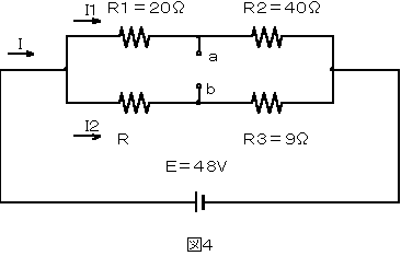 図4の回路において、端子a−bの電位差が20[V]であるとき、抵抗Rを求めよ。