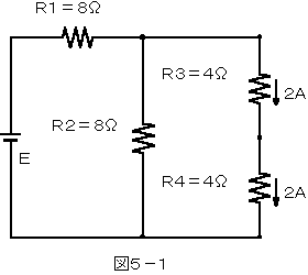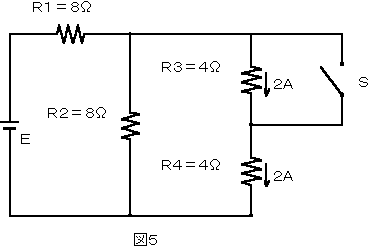 図5の回路において、スイッチSを開いているとき、抵抗R3、R4に2[A]