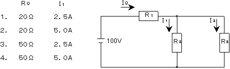 〔No. 2〕 次の図に示す回路において、抵抗R1,R2,及びR3の合成抵抗R0と電流I1の値の組合せとして、正しいものはどれか。