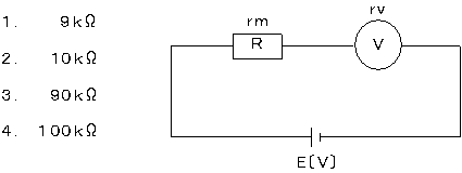 〔No. 3〕 次の図に示す回路において、内部抵抗rv、最大目盛り10Vの永久磁石可動コイル形電圧計を、最大電圧100Vまで測定するための倍率器の抵抗rmの値として、正しいものはどれか。