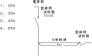 〔No.20〕 図に示す定格電流100Aの配線用遮断器で保護された低圧屋内幹線との分岐点から電線の長さが5mの箇所に分岐幹線保護用遮断器を設ける場合、分岐幹線の電線の許容電流の最小値として、「電気設備の技術基準とその解釈」上、正しいものはどれか。