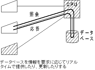 データベース情報を要求に応じてリアルタイムで提供したり、更新したりする処理形態。情報検索型と、取引処理型とがあり、情報検索型としては、経済情報データベース等が、取引処理型では座席予約システムや銀行のオンライン等がある。