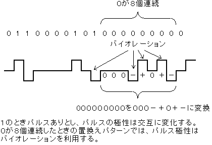 「0」をパルスなし、「1」を正又は負のパルス有りとし、0が8個連続した場合は、1を含む特殊なパターン(000+−+−+又は000−+0+−)に置き換えて伝送する方式。ISDN1次群速度インタフェースで用いられている。