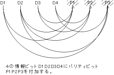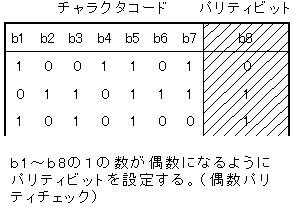 伝送する文字(キャラクタ)の中の1のビット数が偶数又は奇数となるよう冗長ビットを付加して伝送する方式。