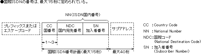 国際ISDNの番号は、ITU−T勧告E.164の中で規定されている。国を識別する国番号(CC)、国内の事業者を識別する国内宛先番号(NDC)、その事業者の加入者を識別する加入者番号(SN)より構成されている。