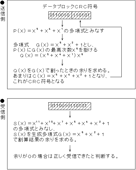 ブロックチェック方式の一つ。データのブロック単位を高次の多項式とみなし、これをあらかじめ定めた生成多項式で割ったときの余りを検査用ビット(チェックビット)として、データブロックの末尾につけて送出し、受信側で受信したデータを同じ生成多項式で割算を行い、余りが0となるか否かで誤りを検出する方式。HDLCの誤り制御方式に採用されている。