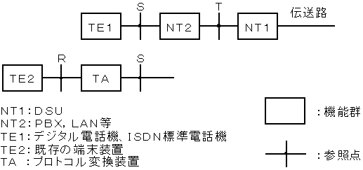 ISDNにおいて、各機能群の分界点を参照点という。T点とS点は、TTC標準JT−I411で定義されているISDNユーザ・網インタフェース点であり、R点は既存のユーザ・網インタフェース点(ITU−T勧告V,Xシリーズ等)である。
