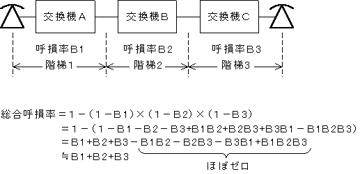 即時式の接続過程において、呼がいくつもの交換機を経て接続される場合、どこかの階梯で出線全話中に出遭う確率。